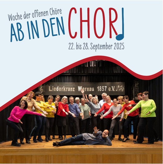 Die offene Probe im Rahmen der „Woche der offenen Chöre“ findet Mittwoch, den 24. September 2025 von 19:30 bis ca. 21:30 Uhr statt.