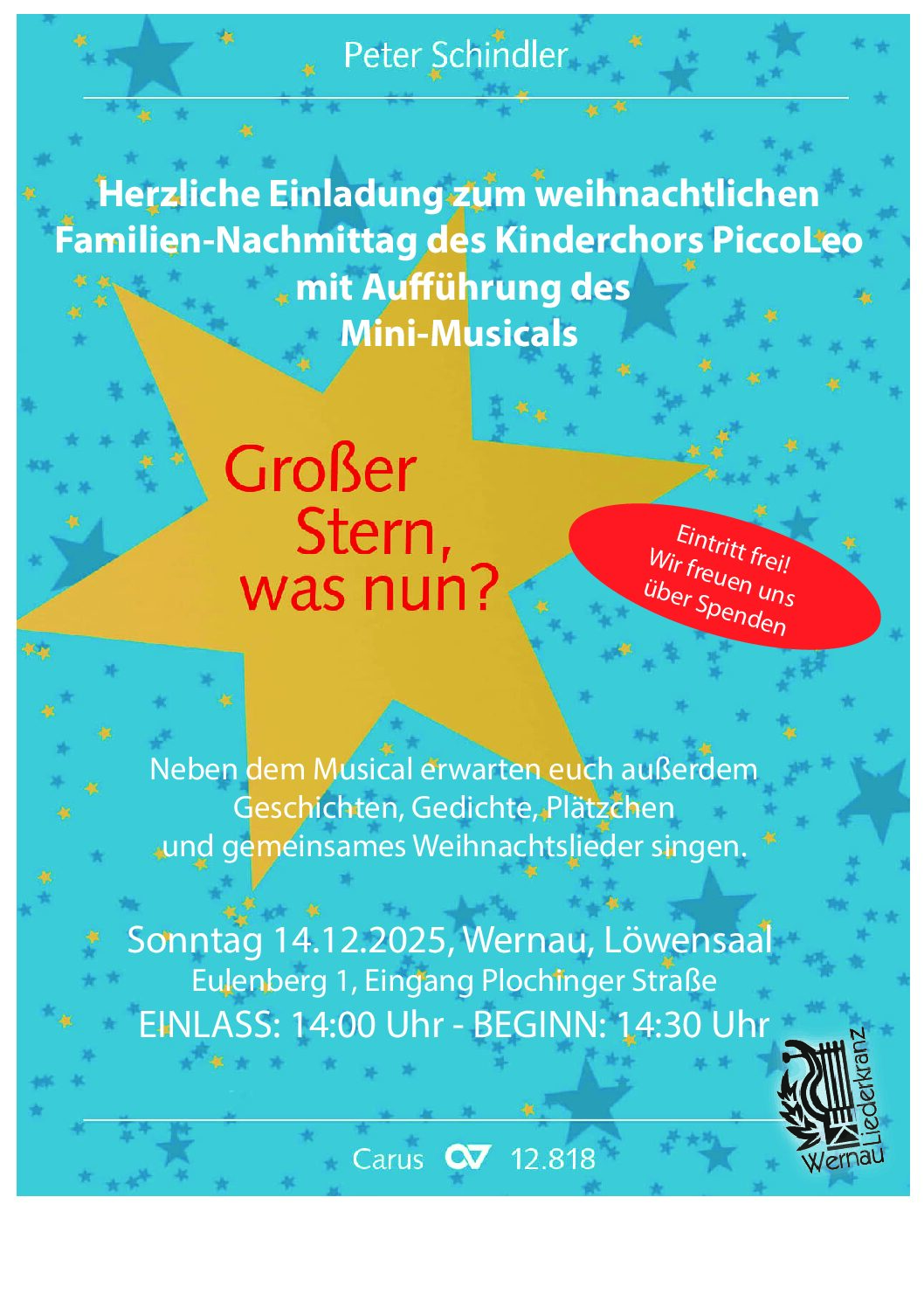 Am Sonntag, 14. Dezember, veranstaltet der Liederkranz Wernau einen Familiennachmittag, bei dem das Mini-Musical im Löwensaal des Vereinshaus Löwen aufgeführt wird. Wir laden alle Interessierten sowie Familien und Freunde der teilnehmenden Kinder ganz herzlich ein. Im Anschluss an die Aufführung gibt es noch ein kleines weihnachtliches Programm mit Gedichten und Geschichten sowie ein gemeinsames Weihnachtslieder-Singen. Plätzchen und Gebäck gibt es natürlich auch.