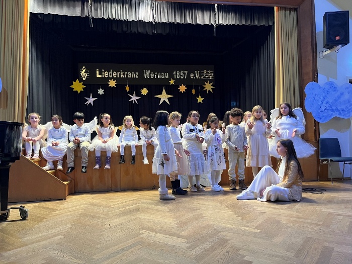 Das Ergebnis konnte sich sehen lassen: Die zwanzig kleinen Engel mussten dem großen Stern von Bethlehem helfen, zurück zu seinem Platz am Himmel zu finden. Er war sehr traurig und ist deshalb vom Himmel herabgefallen. Die Engel trugen ihn auf ihren Flügeln zurück an den Sternenhimmel, so dass er pünktlich zu Weihnachten wieder in vollem Glanz am Himmel erstrahlten konnte. Die Begeisterung der Kinder schlug schnell auf das Publikum über.