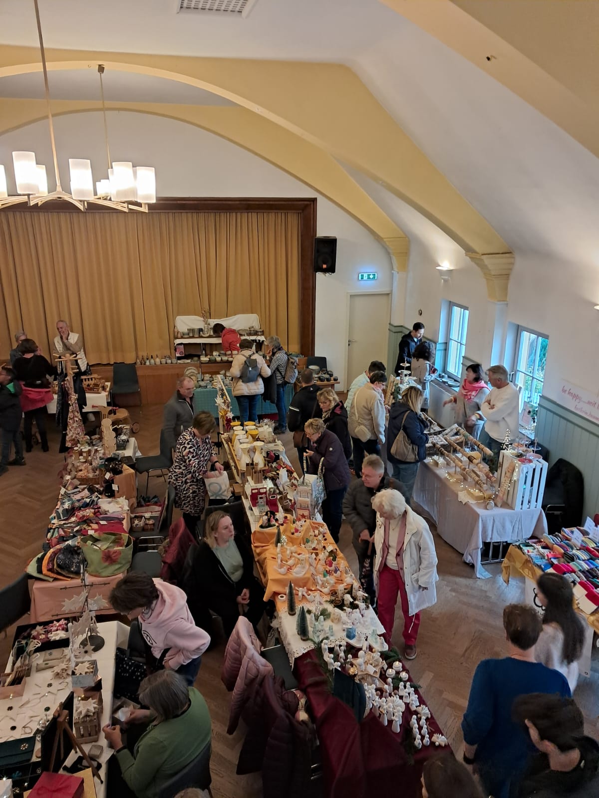 Unser „Kreativmarkt im Obergeschoss, im Löwensaal des Liederkranzes, bot eine Vielzahl an Dingen: Wolle und Gestricktes wie Socken, Mützen und Pullover, Holzspielzeug sowie Vasen, Schalen und Dekoartikel aus Holz, getöpferte Keramik, Deko-Objekte aus Gießkeramik, Stoff in Form von Kissen, Körbchen, Duftkissen und Säckchen, Eingemachte Marmeladen und Gebäck, Schmuck, Dekoratives aus Papier und hübsche Grußkarten, duftende Seifen und kunstvolle Kerzen…